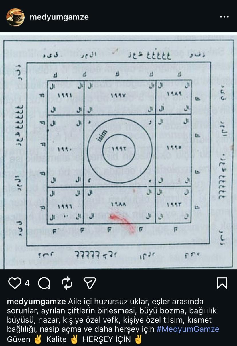 Hürriyet'te yer alan habere göre, sevgilisine bağlanma büyüsü yaptırmak isteyen Ayşegül K., bunun için istenilen, 6 bin TL’yi gönderilen IBAN’a yatırdı. Bir süre sonra kendisini Gamze olarak tanıtan kişi Ayşegül K.’ye mesaj yazarak “Hasan Bey’in annesi Hanife Hanım çocuğuna koruma işlemi yapmış. Bu koruma işlemi (nazar değmesin) geceleri korkmaması için yapılmış ama bizim işleme de etki ediyor. Bizim bu işlemi kaldırmamız lazım. Yani bizim işleme etki eden kısmı kaldıracağız. Fiyatı 8 bin 500 TL’dir. Eğer tutmaz ise yatırdığın iki ücret iade edilecektir” dedi. Ayşegül K., ücretten indirim yapılmasını istedi, yapılan pazarlık sonucu fiyat 7 bin 500 TL’ye indirildi.