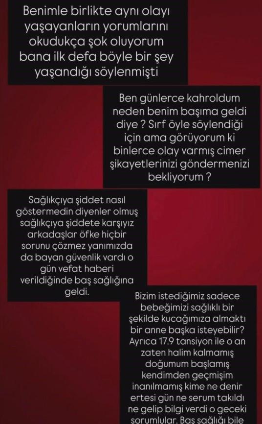 Müdahale sürecine ilişkin de konuşan T.Z., "Beni yarı çıplak vaziyette, koridorda herkesin içinden geçirerek yan taraftaki müdahale odasına aldılar. Orada gereken müdahale yapıldı. Ardından ameliyathaneye indim, orada da müdahale yapıldı. Daha sonra odaya geri getirildim. Bebeği görmek için belli saatler varmış. Emzirme eğitimi verildi bana. O saatlerde yukarı görmeye çıkacaktık. Bana bir telefon geldi. "Eşiniz yukarı gelsin' dendi. Eşim yukarı gitti. Bebeğimizin vefat ettiğini söylemişler. Yaşarken görmedik bebeği hiçbir şekilde. Durumu böyle kötüyse söyleyebilirlerdi. Eşim o halde görmüş ben ertesi gün morgda gördüm bebeğimi" diye konuştu. T.Z., bebeğinin ölümünün ardından herhangi bir açıklama yapılmadığını da belirterek, "Daha sonra odaya kimse gelmedi başsağlığına. Hiçbir şekilde bir açıklama yapılmadı. Bana ne müdahale edildi bilmiyorum. Ne yapıldı, hiç kimse bir şey söylemedi. Aldığımız epikrizlerden gördük. Ertesi gün bebeği aldık, defnettik. Bana çok kötü davranıldı. Hastaneye gittiğimizde zorla muayene edilmeye çalıştım. Tansiyonum 17-18 arasındaydı. Gerçekten çok kötü bir durumdaydım. Bana hiç iyi bir şekilde yaklaşılmadı o durumda" dedi.