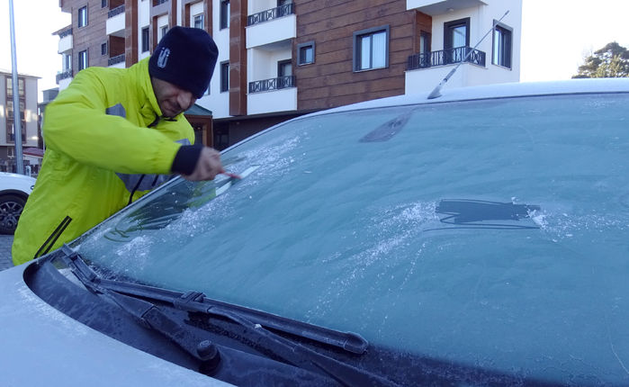 Sabah saatlerinde işe giden vatandaşlar, araç camlarındaki buzları kazıdı.