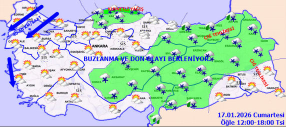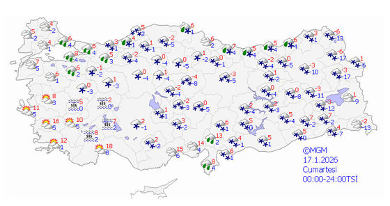Meteoroloji Genel Müdürlüğü tarafından yapılan tahminlere göre ülkemiz genelinin parçalı ve çok bulutlu, Marmara'nın kuzey ve doğusu ile Osmaniye ve Hatay çevrelerinin yağmur ve karla karışık yağmurlu, Karadeniz, İç Anadolu, Doğu Anadolu, Güneydoğu Anadolu'nun batısı ile Kütahya’nın kuzeyi, Afyonkarahisar'ın doğusu ve Kahramanmaraş çevrelerinin karla karışık yağmur ve kar yağışlı geçeceği tahmin ediliyor.