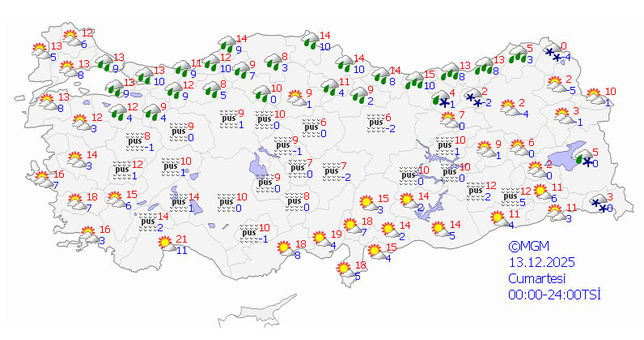 Meteoroloji Genel Müdürlüğü tarafından yapılan tahminlere göre ülkemizin kuzey, iç ve doğu kesimlerinin parçalı ve çok bulutlu, Marmara’nın kuzeydoğusu, Batı Karadeniz, Orta ve Doğu Karadeniz kıyıları ile Çankırı, Iğdır, Batman, Mardin, Siirt ve Şırnak çevrelerinin yağmur ve sağanak yağışlı, Orta ve Doğu Karadeniz’in iç kesimleri ile Ardahan, Kars, Bingöl, Erzurum, Muş, Ağrı, Bitlis, Van ve Hakkari çevrelerinin karla karışık yağmur ve kar yağışlı, diğer yerlerin az bulutlu ve açık geçeceği tahmin ediliyor.