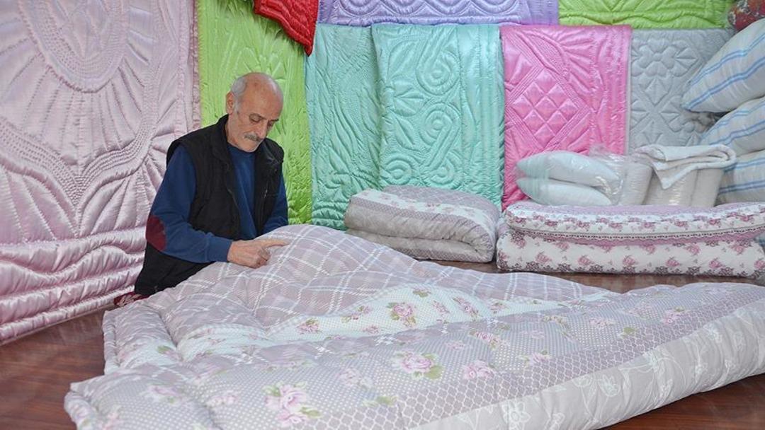 "KIŞA HAZIRLIK YAZDAN BAŞLIYOR"Yorgan ustası Şinasi Toprak, Babasından öğrendiği mesleği 40 yıldır devam ettirdiğini ifade ederek, "Bize genelde yünü ve bezini müşteri getiriyor, bizde burada sırıma işlemini yapıp teslim ediyoruz. Sipariş üzerine aldığımız yorganlarda ada biz yünü Uşaktan alıp yıkattırıyoruz daha sonra taratıp çırptırıyoruz. Tek kişilik bir yorganı 2 saatte çift kişilik bir yorganı da yaklaşık 3 saate sırıyabiliyoruz. İlk önce bezini dikiyoruz, daha sonra müşteri yünü torbaya basıp getirdiği için onu tekrardan bir elden geçirtmek gerekiyor, doldurmasını yapıp düzlüyoruz ve en son dikme işlemini bitene kadar yapıyoruz. Kışa hazırlık yazdan başlıyor. Genelde işlerimiz yazın daha yoğun oluyor. Yün yıkama, kurutuma, çırpma gibi işlemeleri kışın yapma gibi bir imkanları yok. O yüzden yazdan bu işlemler yapılıyor" diye konuştu.
