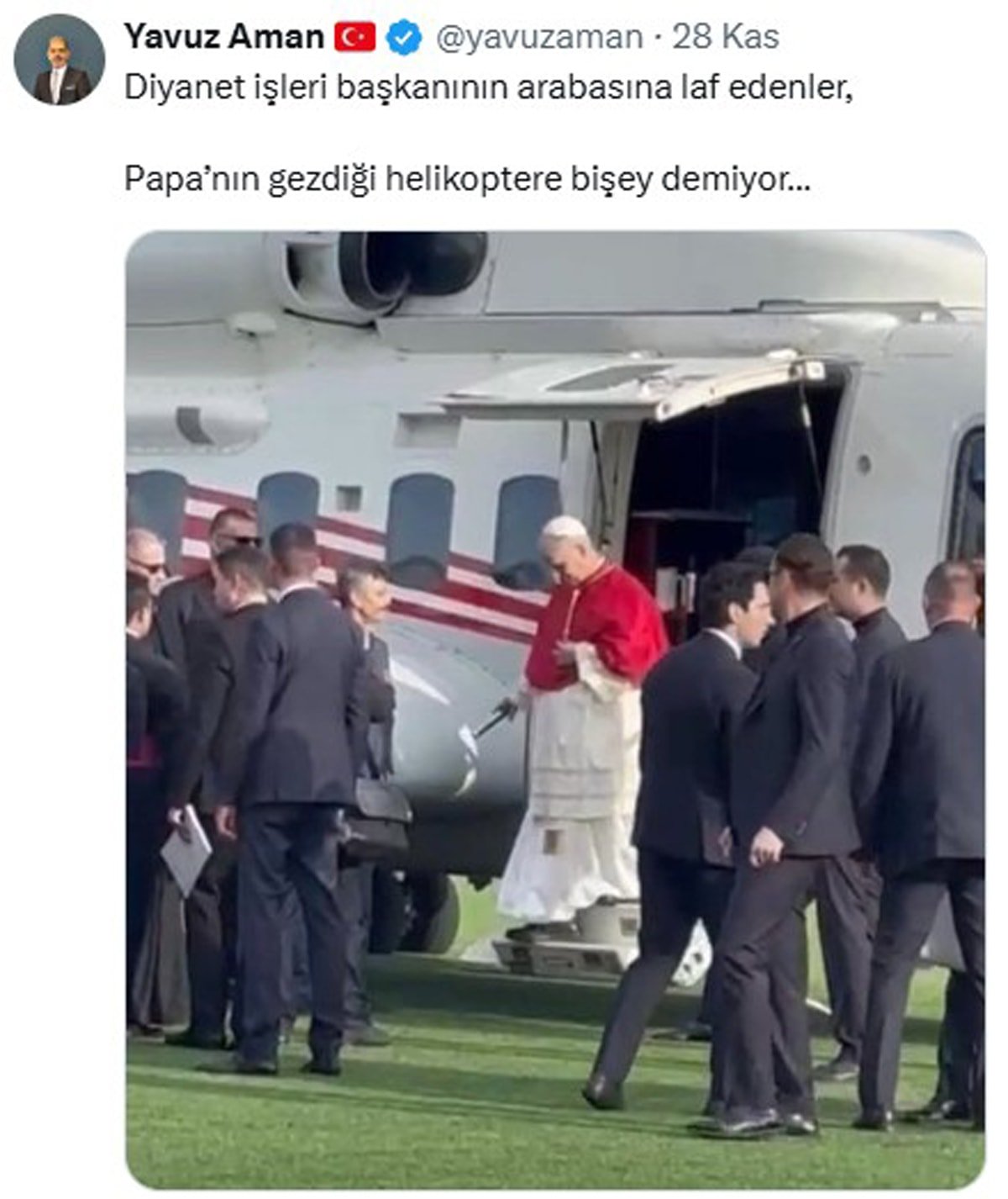 AKP’li Yavuz Aman, Vatikan Devlet Başkanı Papa’yı, yurt dışı gezileri ve lüks otomobilleriyle hatırlanan eski Diyanet İşleri Başkanı Ali Erbaş ile karşılaştırdı. Aman, “Diyanet İşleri Başkanı’nın arabasına laf edenler, Papa’nın gezdiği helikoptere birşey demiyor” diye yazınca sosyal medya karıştı.