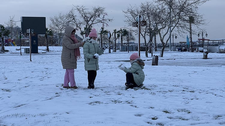 Uyandıklarında her yerin bembeyaz olduğunu gördüklerini ifade eden Çakır, "Torunumu aldım, hemen sahile indik. Kar topu oynadık, kardan adam yapmaya çalıştık. Okullar da tatil oldu ve torunum bugün çok mutlu. İnşallah uzun süre yağar." dedi.