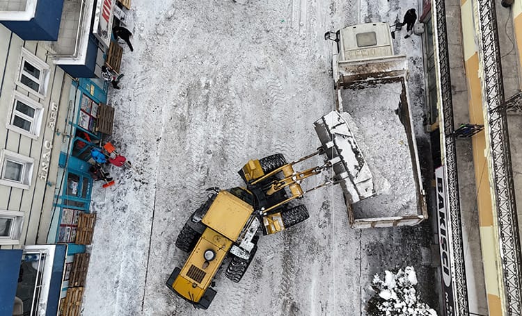 Sarıkamış'ta belediye ekipleri, caddelerde biriken karları kamyonlarla ilçe dışına taşıyor.