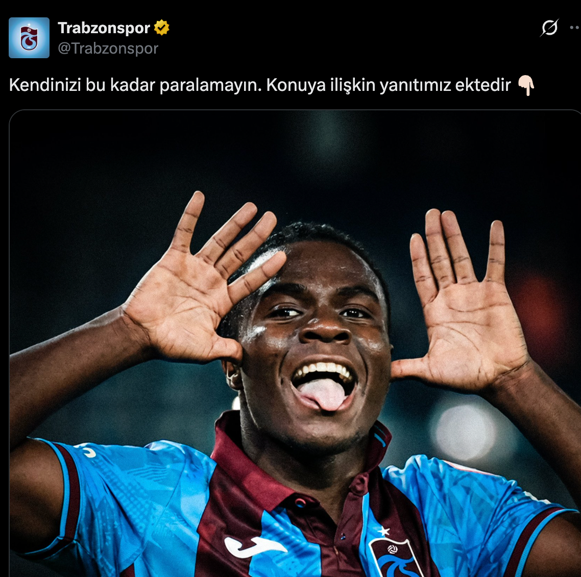 Trabzonspor da sosyla medya hesabından flaş bir paylaşım yaptı. Bordo mavililer Oulai'nin gol sevincini paylaşarak, “Kendinizi bu kadar paralamayın. Konuya ilişkin yanıtımız ektedir” paylaşımı yaptı. Gönderi kısa sürede gündem oldu.