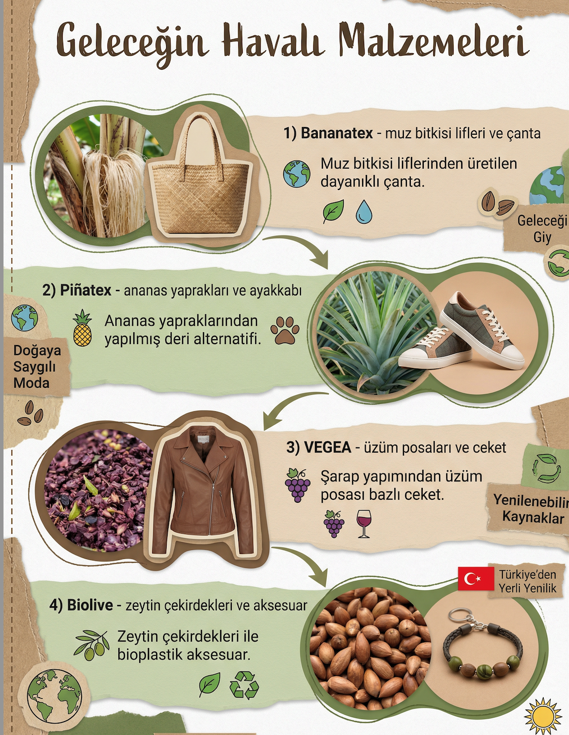 PEKİ, BİZ NE YAPABİLİRİZ? GELECEK BİZİM ELLERİMİZDEBananatex, Piñatex, VEGEA gibi malzemeler, modanın geleceğinin ne kadar parlak olabileceğini gösteriyor. Bu yenilikler sayesinde artık şıklığımız için doğadan ödün vermek zorunda değiliz. Peki biz ne yapabiliriz? Artık bir ürün alırken sadece ne kadar güzel olduğuna değil, hikayesine de bakabiliriz. "Bu neyden yapılmış?", "Çevreye dost mu?" gibi sorular sorabiliriz. GOTS, OEKO-TEX gibi sertifikalar taşıyan ürünleri tercih edebiliriz.