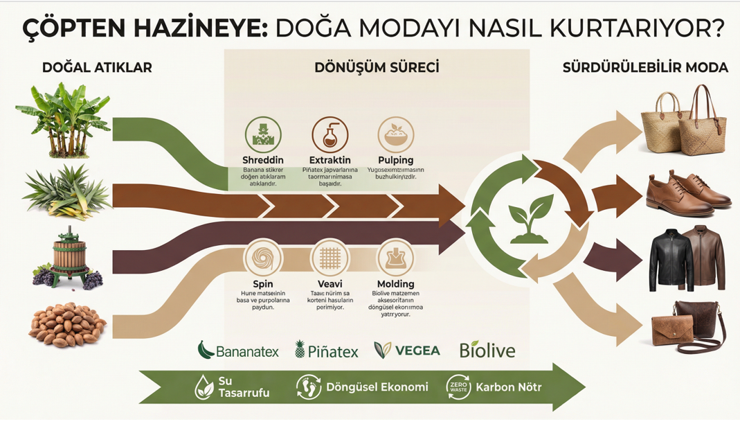 Neyse ki harika bir gelişme var! Zeki ve doğa aşığı insanlar, "atık" diye gördüğümüz şeylerden inanılmaz moda ürünleri yapmanın bir yolunu buldu. Artık çöpe giden muz bitkisi lifleri, ananas yaprakları, üzüm posaları ve hatta zeytin çekirdekleri; en lüks markaların bile koleksiyonlarını süsleyen havalı ve kaliteli malzemelere dönüşüyor. Gelin, bu sihirli dönüşümün hikayesine birlikte göz atalım.