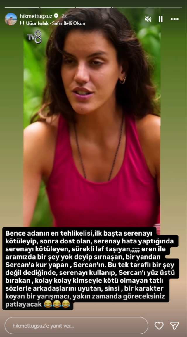 Survivor'ın eski yarışmacılarından Hikmet Tuğsuz, Instagram hesabından yaptığı paylaşımda Deniz’in ada içindeki tavırlarını hedef aldı. Tuğsuz, yarışmacının davranışlarını eleştirirken ada içindeki ilişkiler üzerinden de dikkat çeken ifadeler kullandı.