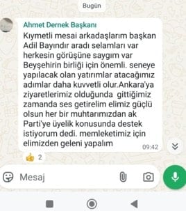 Erol mesajında, “Üyelik için Kahraman Başkan ( AKP Beyşehir İlçe Başkanı) parti teşkilat sorumlusu Yunus Huğlu ile irtibata geçilmesi gerektiğini iletti. Hepinize selamı var. Her muhtardan en az 10 ve üzeri bekleniyor. Yunus’un numarasını atıyorum. Kişilerle birlikte ilçe teşkilatına gelebilirsiniz ya da teşkilattan üyelik kağıtlarını alıp kendiniz doldurup iletebilirsiniz. Bir hafta süresi var, ağırdan almayın” ifadelerine yer verdi.