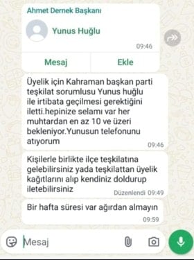 “HER MUHTARDAN EN AZ 10 ÜYE BEKLENİYOR”Dernek Başkanı muhtarlara gönderdiği bir başka mesajda ise, AKP Teşkilat Sorumlusu Yunus Huğlu’nun numarasını paylaşarak kendisiyle üyeler ile ilgili irtibata geçmelerini istedi.
