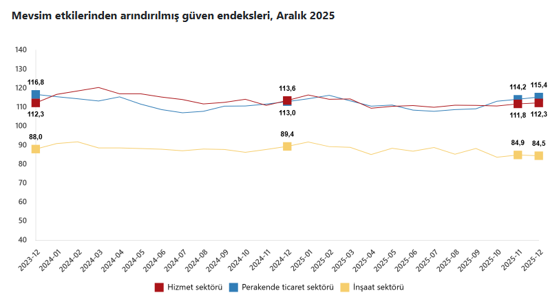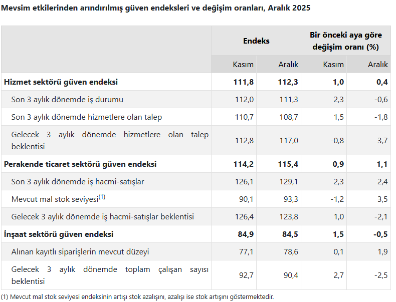 TÜİK, Güven Endeksi verilerini açıkladı. Buna göre mevsim etkilerinden arındırılmış güven endeksi Aralık ayında bir önceki aya göre; hizmet sektöründe yüzde 0,4 oranında artarak 112,3 değerini, perakende ticaret sektöründe yüzde 1,1 oranında artarak 115,4 değerini ve inşaat sektöründe yüzde 0,5 oranında azalarak 84,5 değerini aldı.