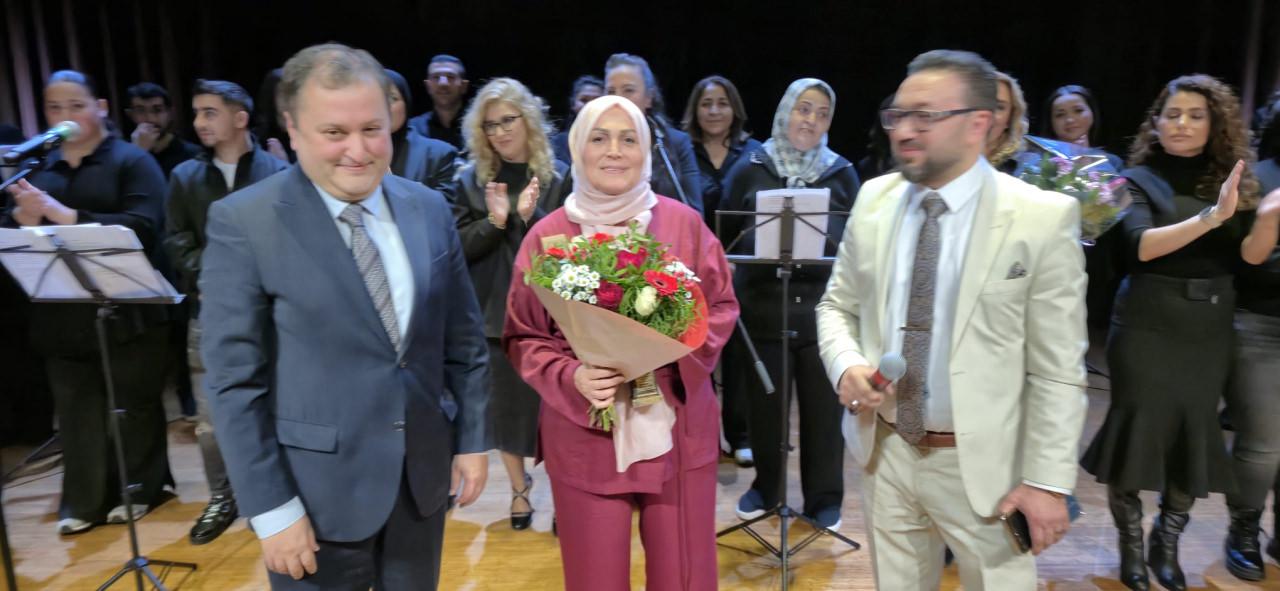 Ana Vatan Avrupa Azerbaycan Kadınlar Birliği Başkanı Mayise Agamirzeyeva Gundogdu, gazeteci Yavuz Nufel'in çalışmalarını takdirle karşıladığını belirterek, Karabağ’ın özgürlüğüne kavuşmasında bir gazeteci olarak verdiği destekten dolayı kendisine teşekkür ve bir başarı plaketi ile birlikte bir de bordo-mavi şal takdim etti.