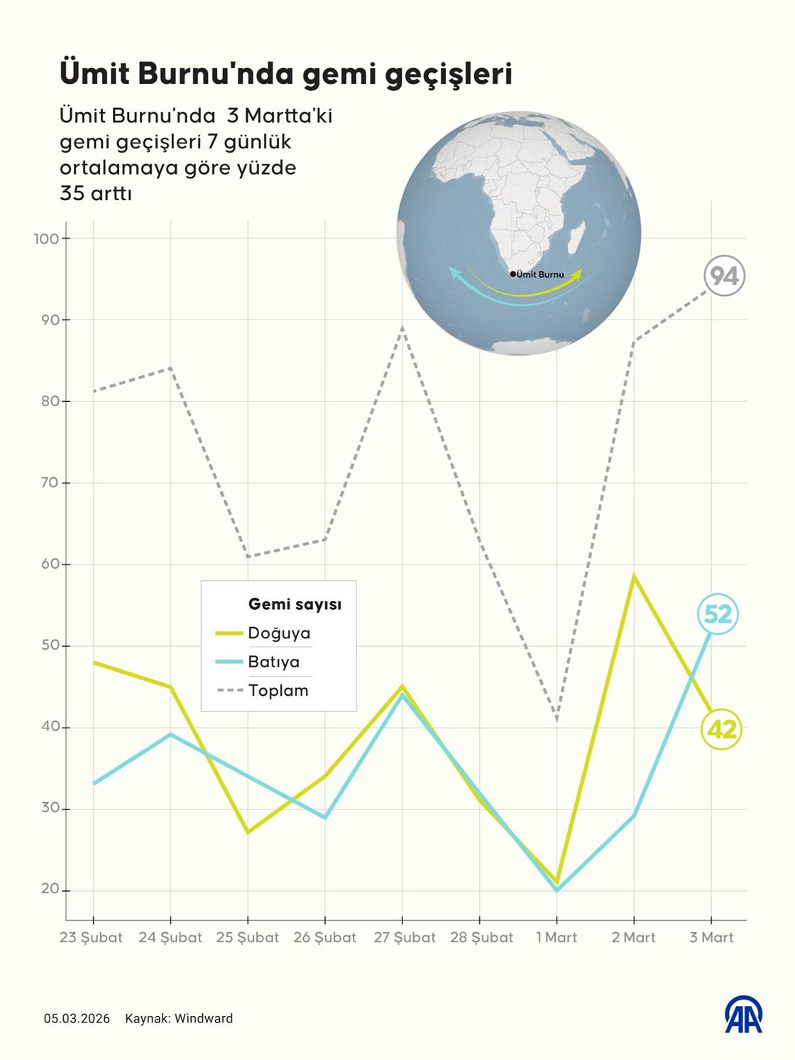 Windward'ın verilerine göre, Ümit Burnu'ndaki transit gemi sayısı 2 Mart'ta önceki güne göre yüzde 112 artışla 87'ye yükseldi. Bu rakam, 3 Mart'ta ise günlük yüzde 8 artışla 94 oldu.