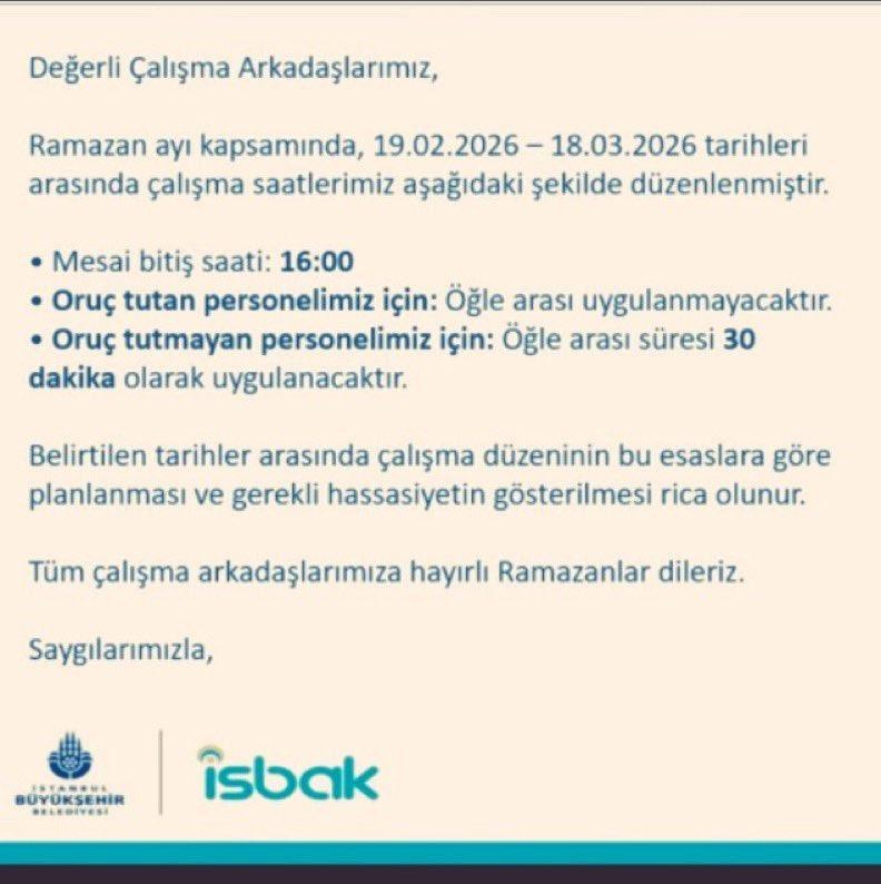 İstanbul Büyükşehir Belediyesi iştiraki olan İSBAK bünyesinde çalışan personele gönderilen genelgede, Ramazan ayı boyunca mesai bitiş saatinin 17.00'dan 16.00'a çekildiği, ancak oruç tutmayan personelin 30 dakika öğle arası kullanmasına izin verilirken, oruç tutan çalışanlar için öğle arası uygulamasının tamamen kaldırıldığı bildirildi.