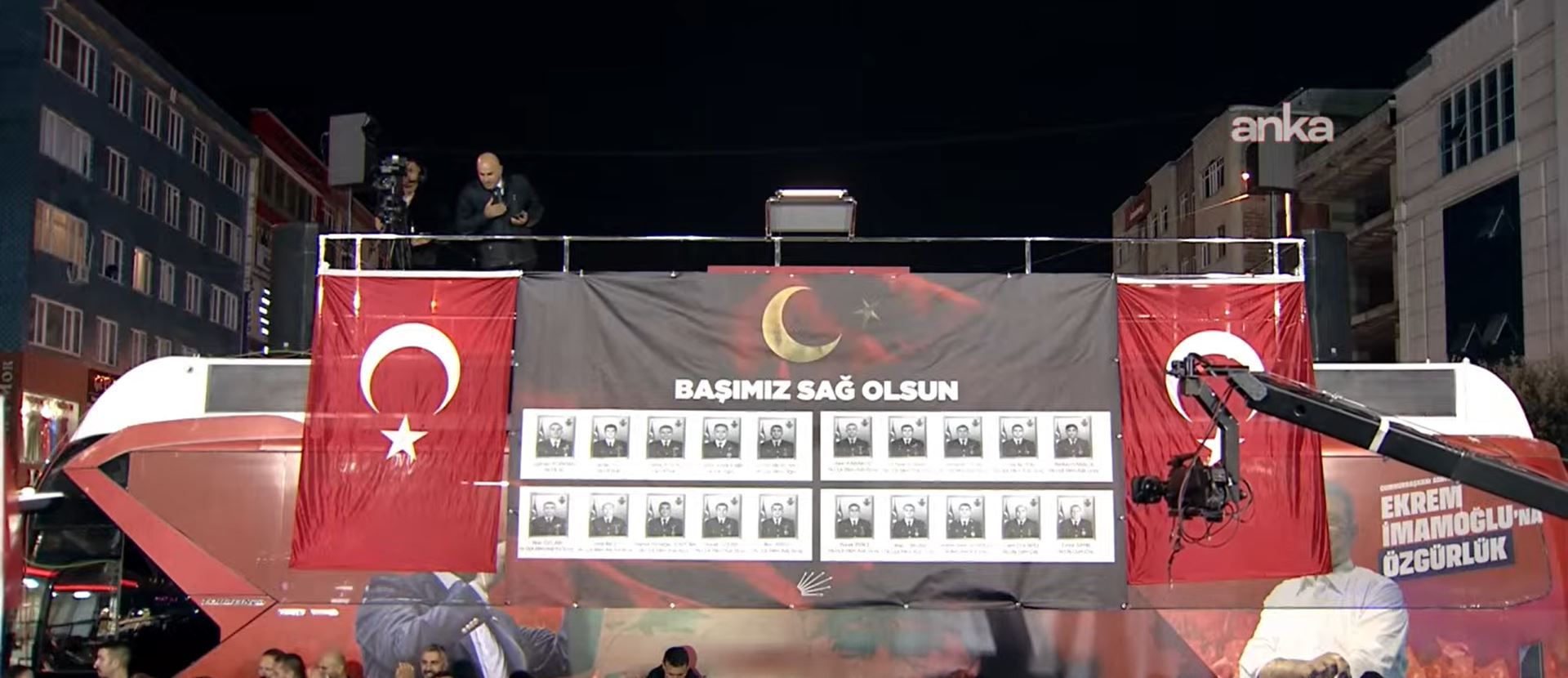 Düşen askeri uçakta şehit olan 20 askerin fotoğrafları CHP'nin miting otobüsüne asıldıİDDİANAMENİN AÇIKLANMASININ ARDINDAN CHP İLK KEZ MEYDANDASultanbeyli Kent Meydanı Atatürk Anıtı önünde düzenlenen mitingte Gürcistan'da düşen kargo uçağında şehit olan 20 asker de anılırken, CHP Lideri Özgür Özel'in de dikkat çeken açıklamalarda bulunması bekleniyor.