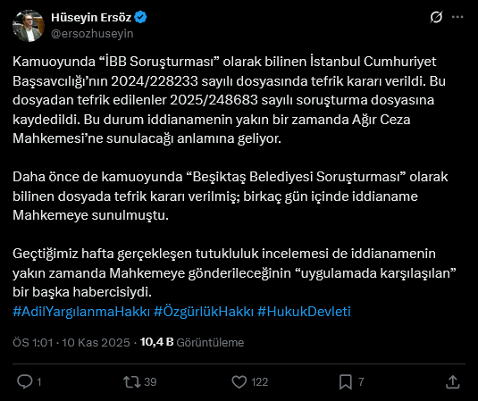"Kamuoyunda “İBB Soruşturması” olarak bilinen İstanbul Cumhuriyet Başsavcılığı’nın 2024/228233 sayılı dosyasında tefrik kararı verildi. Bu dosyadan tefrik edilenler 2025/248683 sayılı soruşturma dosyasına kaydedildi. Bu durum iddianamenin yakın bir zamanda Ağır Ceza Mahkemesi’ne sunulacağı anlamına geliyor.