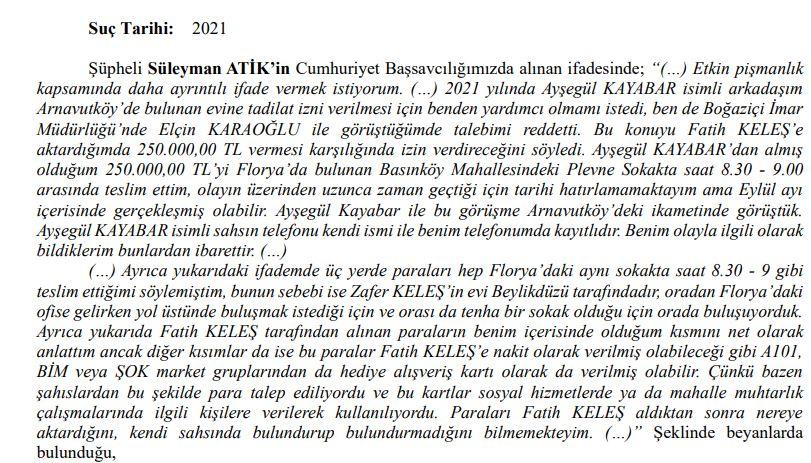 Atik ifadesinde, “2021 yılında Ayşegül KAYABAR isimli arkadaşım. Arnavutköy’de bulunan evine tadilat izni verilmesi için benden yardımcı olmamı istedi, ben de Boğaziçi İmar Müdürlüğü’nde Elçin Karaoğlu ile görüştüğümde talebimi reddetti. Bu konuyu Fatih Keleş'e aktardığımda 250.000,00 TL vermesi karşılığında izin verdireceğini söyledi. Ayşegül KAYABAR’dan almış olduğum 250.000,00 TL’yi Florya’da bulunan Basınköy Mahallesindeki Plevne Sokakta saat 8.30 - 9.00 arasında teslim ettim, olayın üzerinden uzunca zaman geçtiği için tarihi hatırlamamaktayım ama Eylül ayı içerisinde gerçekleşmiş olabilir. Ayşegül Kayabar ile bu görüşme Arnavutköy’deki ikametinde görüştük.” dedi.