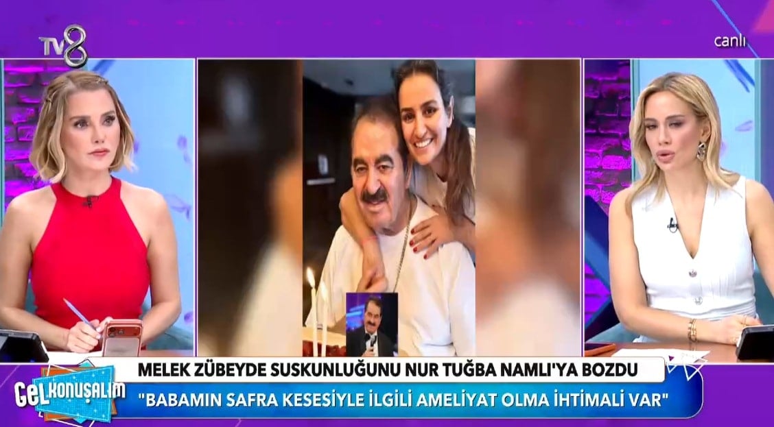 TV 8'de yayınlanan Gel Konuşalım programında İbrahim Tatlıses ile ilgili flaş gelişme paylaşıldı. Yoğun bakımda tedavi altında olan İbrahim Tatlıses ile ilgili yeni bilgiler gelmeye devam ediyor. Nur Tuğba Namlı, sanatçının son durumu hakkında kızı Melek Zübeyde'nin son dakika açıklamalarını paylaştı.