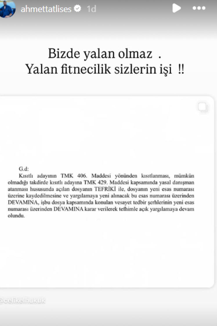 Bu paylaşıma Ahmet Tatlıses’ten de gecikmeden yanıt geldi. Ahmet Tatlıses, avukatının eski paylaşımını yayımlayarak; "Bizde yalan olmaz. Yalan, fitnecilik sizin işiniz" ifadelerini kullandı.