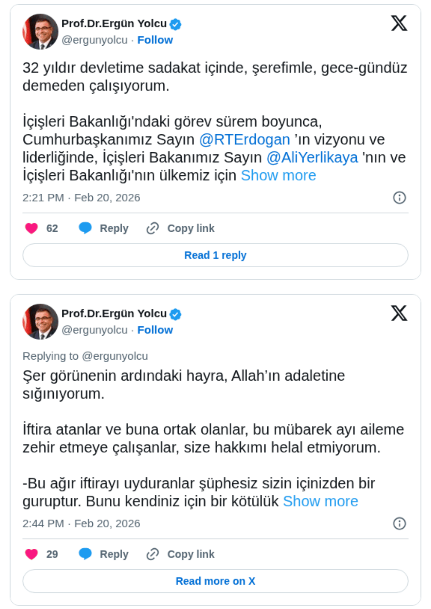 Eski İçişleri Bakanı Ali Yerlikaya'nın danışmanı Ergün Yolcu, hakkında ortaya atılan "bakanlıktan bilgi sızdırdığı" iddialarına ilişkin sosyal medya hesabından açıklama yaptı.