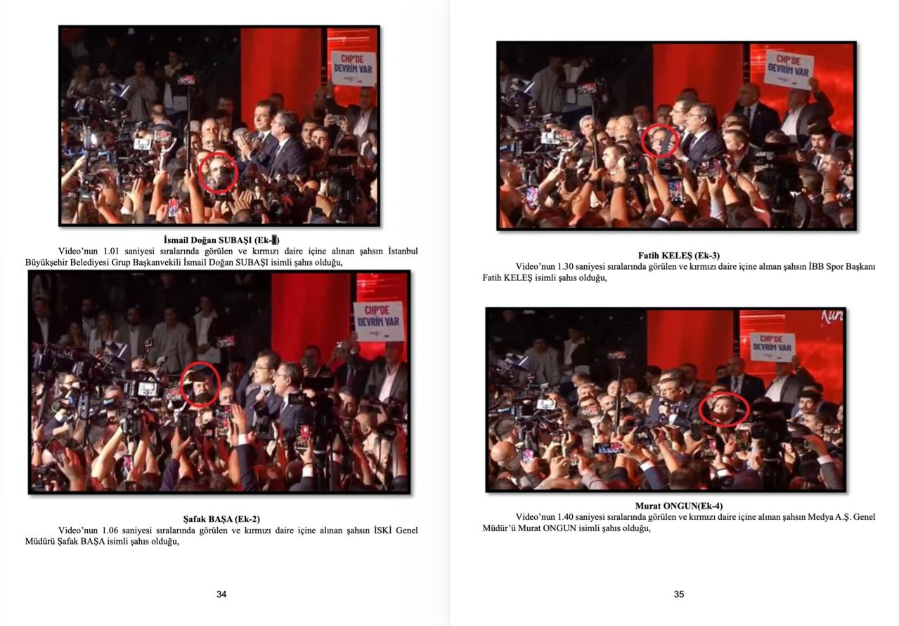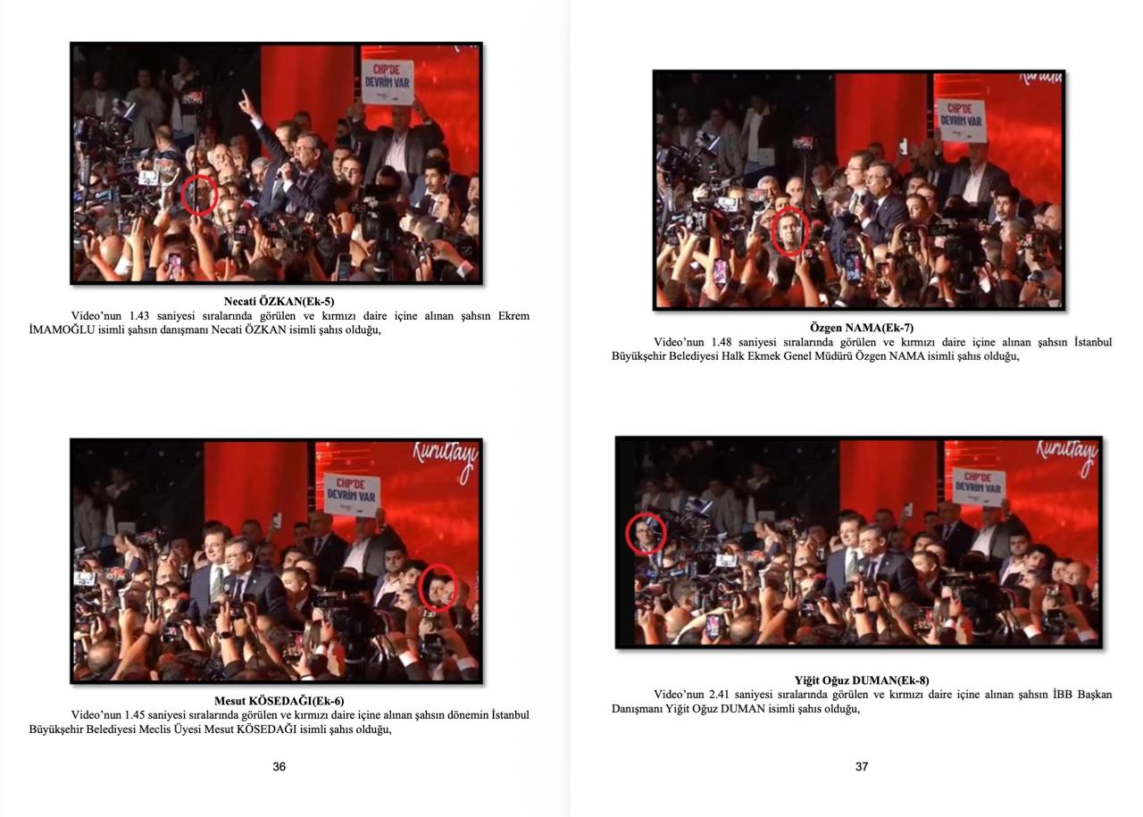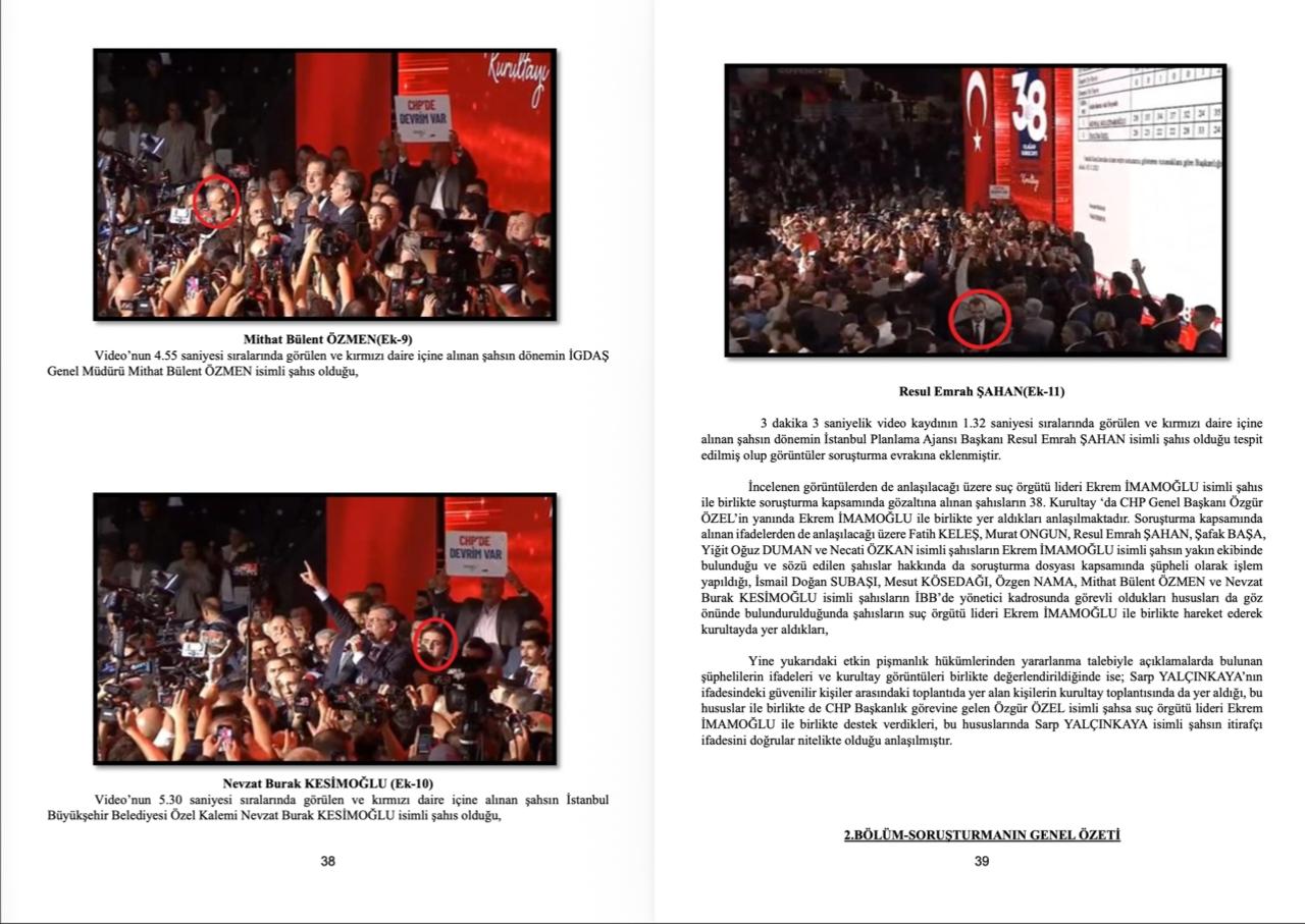 “İncelenen görüntülerden de anlaşılacağı üzere suç örgütü lideri Ekrem İmamoğlu isimli şahıs ile birlikte soruşturma kapsamında gözaltına alınan şahısların 38. Kurultay’da CHP Genel Başkanı Özgür Özel’in yanında Ekrem İmamoğlu ile birlikte yer aldıkları anlaşılmaktadır...”