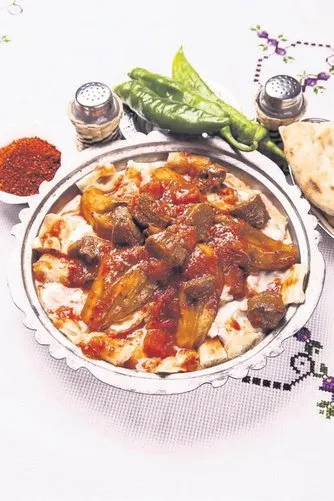 YAPILIŞI: Öncelikle doğradığımız soğanları ve biberleri zeytinyağında kavuruyoruz. Üzerine etleri koyup suyunu salıp çekene kadar kavuruyoruz. Salçaları ve domatesi ilave edip biraz daha kavurup, sıcak suyu, tuzu ve karabiberi ilave edip düdüklü tencerede etler yumuşayana kadar pişiriyoruz. Suyunu çok koymamızın sebebi, pideleri yemeğin suyu ile ıslatacak olmamız. Yemeğimiz pişerken patlıcanları az yağda kızartıyoruz. Yemeğimiz piştiğinde patlıcanları ilave edip bir-iki taşım kaynatıyoruz. Pideleri doğrayıp servis tabağına alıyoruz. Üzerine yemeğin suyundan koyup sarımsaklı yoğurdu gezdiriyoruz.