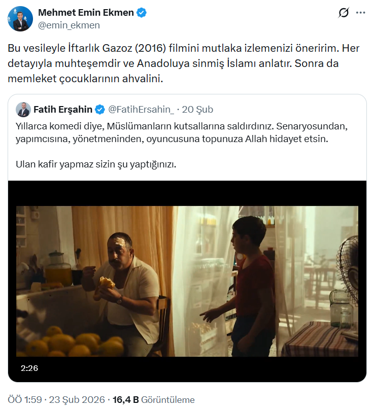 Konuyla ilgili paylaşım yapan Deva Partisi Genel Başkan Yardımcısı Mehmet Emin Ekmen ise "Bu vesileyle İftarlık Gazoz (2016) filmini mutlaka izlemenizi öneririm. Her detayıyla muhteşemdir ve Anadolu’ya sinmiş İslam’ı anlatır. Sonra da memleket çocuklarının ahvalini" ifadelerine yer verdi.