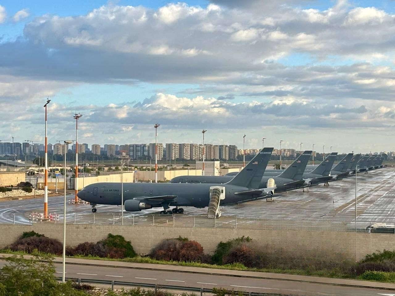 İsrail'de çekilen görüntülerde, havada yakıt ikmali yapan tanker uçaklarının İsrail'in Ben Guiron Havalimanı'nda hazırda bekletildiği görüldü.
