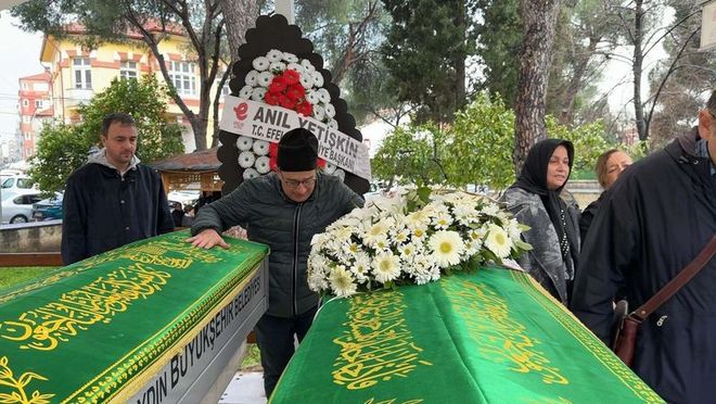 TABUTLARA SARILIP, GÖZYAŞI DÖKTÜ Otopsi işlemleri tamamlanan çift için dün Aydın Bey Camii'nde cenaze namazı kılındı. Cenazeye, Çakaloğlu çiftinin yakınları ve Efeler Belediye Başkanı Anıl Yetişkin katıldı. Çiftin oğulları Ahmet ve Serhat Çakaloğlu, cami bahçesinde taziyeleri kabul etti.