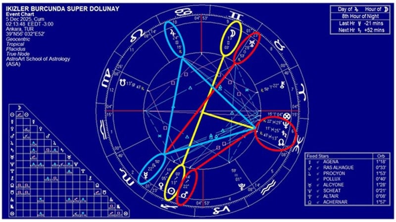 Yılın son süper dolunayına hazır mısınız? Bu kez entelektüel ve bilgi yüklü bir dolunaya doğru ilerliyoruz. Pek çok yeni şey öğrenebiliriz. Bunlardan bazıları bilmediğimiz ve farkında olmadığımız ya da bizden gizlenen şeylerle ilgili olabilir. Zihinsel aktiviteyi tetikleyecek olan bu dolunay, zihnimizde dolanacak fikirler ve düşünceler dolayısıyla uykusuz geçecek birkaç gecenin habercisi de olabilir. Dolunay 5 Aralık 2026’da saat 02.13’te gerçekleşiyor. Bu konu hakkında detaylı bilgi verdiğim videoyu izlemek için tıklayınız https://www.youtube.com/watch?v=NOklpAIBO9A Aşağıda dolunay haritasını görmektesiniz.