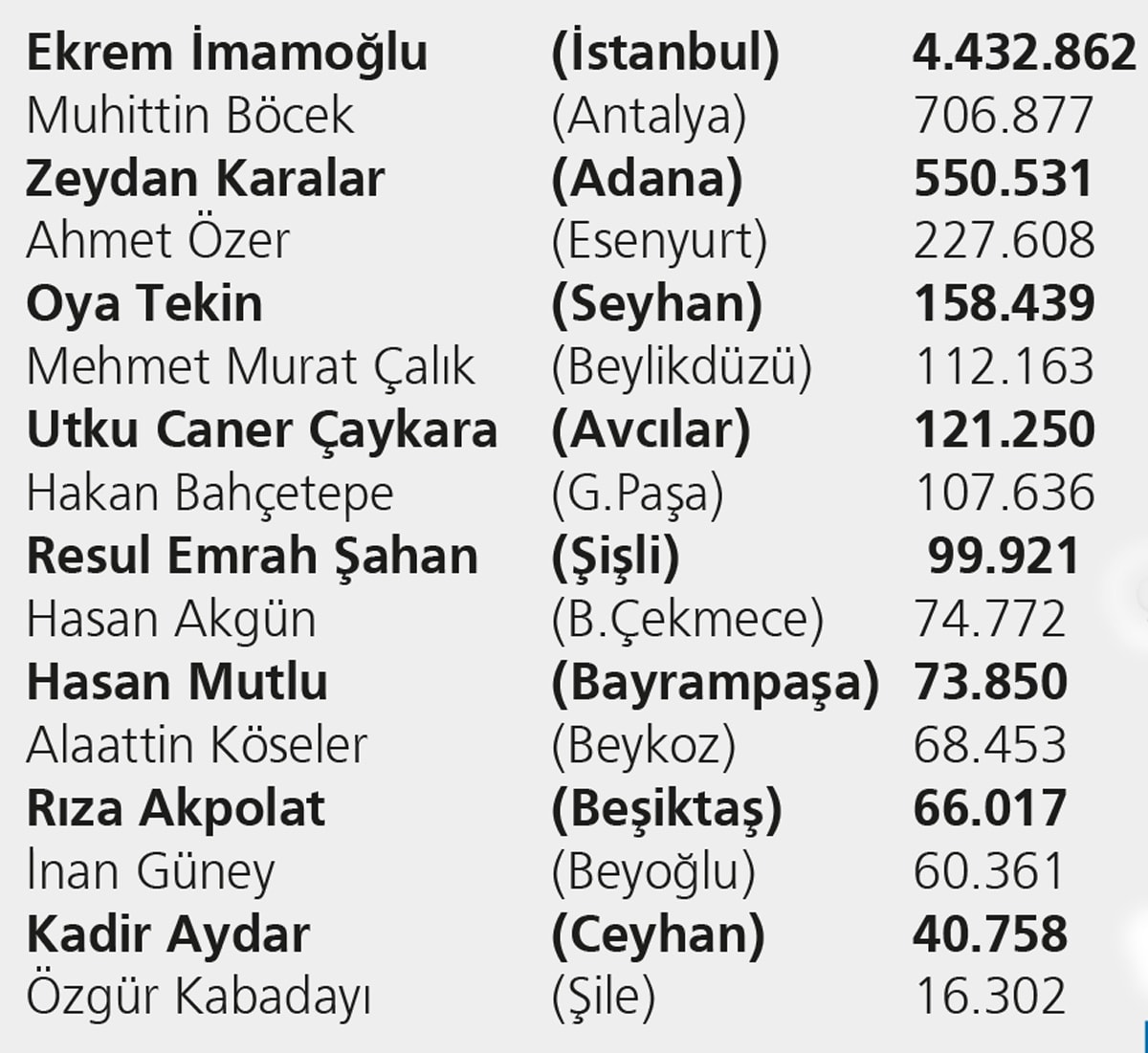Aziz İhsan Aktaş iddianamesinde hapis cezaları istenen CHP’li belediye başkanlarının ve iddianamesi henüz düzenlenmeyen başkanların aldığı oylar şöyle: