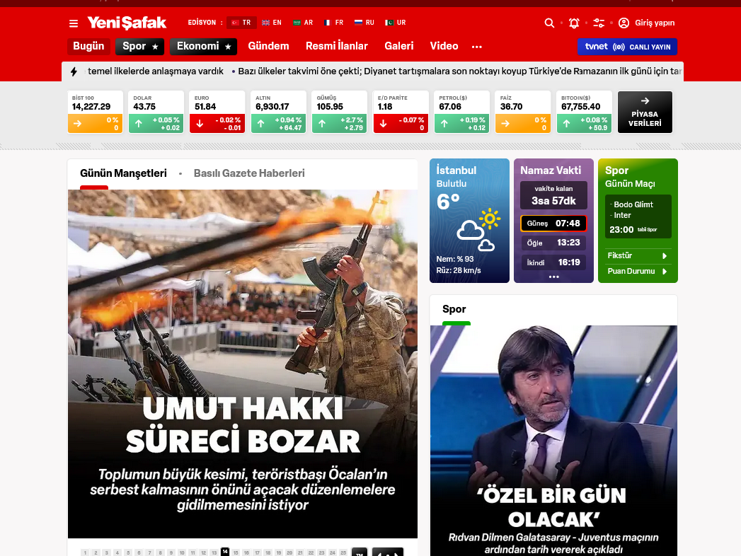 YENİ ŞAFAK "ÖRTÜLÜ AF" DEDİYeni Şafak, terör örgütü PKK’nın lideri Öcalan’ın “serbest kalacağı” düzenlemelerin toplum tarafından istenmediğini yazdı. Gazete, Umut Hakkı kavramının toplum içinde büyük rahatsızlık yarattığını belirterek, şehit ailelerinin buna karşı çıkmasının beklendiğini ifade etti.