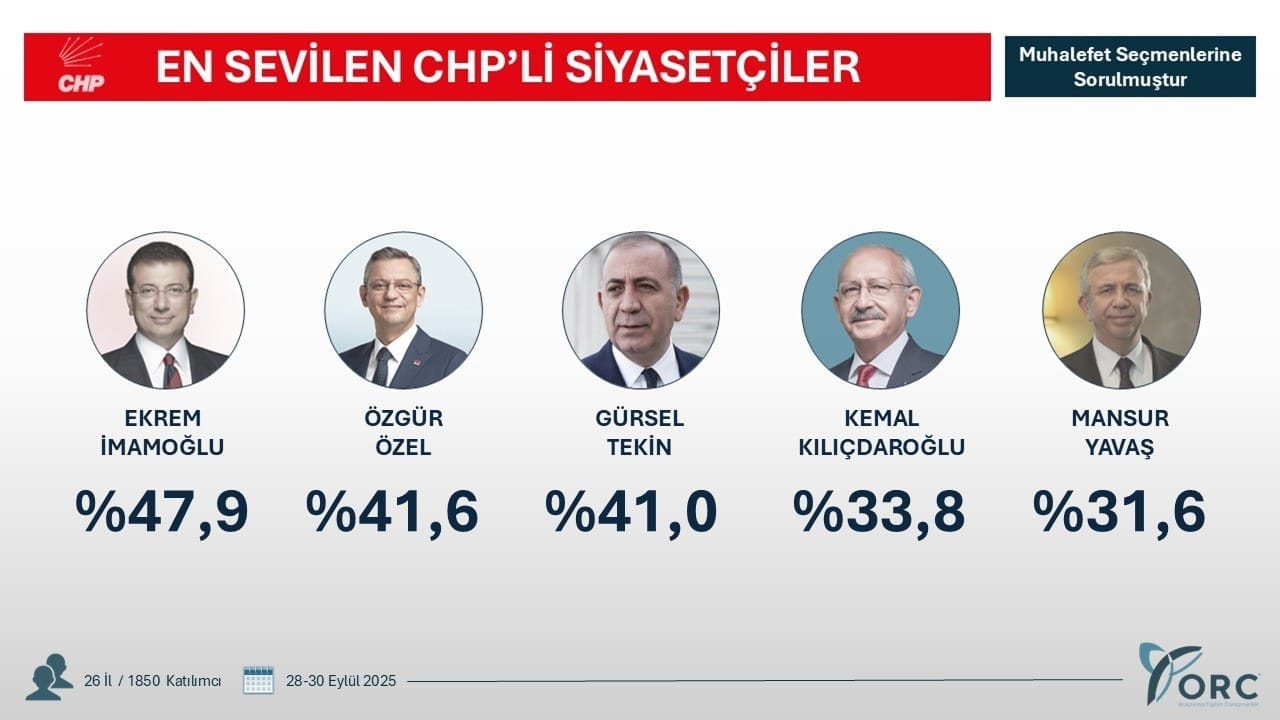 KAYYUM GÜRSEL TEKİN'İN DAHA ÇOK SEVİLDİĞİNİ İDDİA ETMİŞLERDİORC Araştırma, daha önce 28-30 Eylül tarihleri arasında 26 ilde muhalif seçmenlerle yaptığı "En Sevilen CHP’li Siyasetçiler Kimlerdir?" anketiyle gündem olmuştu. Sonuçlar, kamuoyunda büyük şaşkınlık yaratmıştı.
