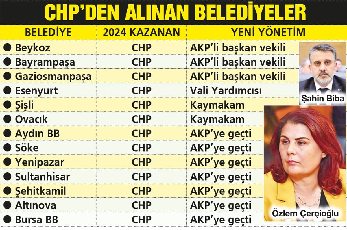 Operasyonlar ile tutuklanan CHP’li belediye başkanlarının yerine belediye meclislerinde çoğunluğu varsa AKP’li bir üye, yoksa istifalar ile denge değiştirilip yine AKP’li bir üye belediye başkanı olarak seçiliyor. AKP sandıkta kaybettiği başkanlıkları bu yolla elde ediyor.