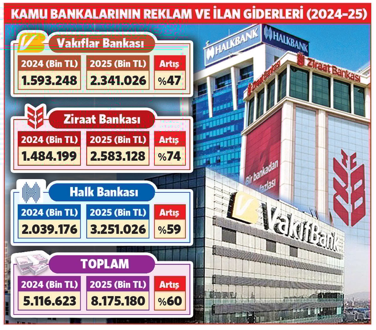 Vakıflar Bankası’nın reklam giderleri de yükseldi. 2024 yılında 1 milyar 593 milyon TL olan ilan harcaması 2025 yılında 2 milyar 341 milyon TL’ye çıktı. Vakıflar Bankası’nın reklam harcamalarındaki artış yüzde 47 oldu. Halk Bankası’nda ise 2024 yılında 2 milyar 39 milyon TL olan reklam ve tanıtım giderleri, 2025 yılında 3 milyar 251 milyon TL’ye yükseldi. Halk Bankası’nın reklam harcamalarındaki artış yüzde 59 olarak hesaplandı.