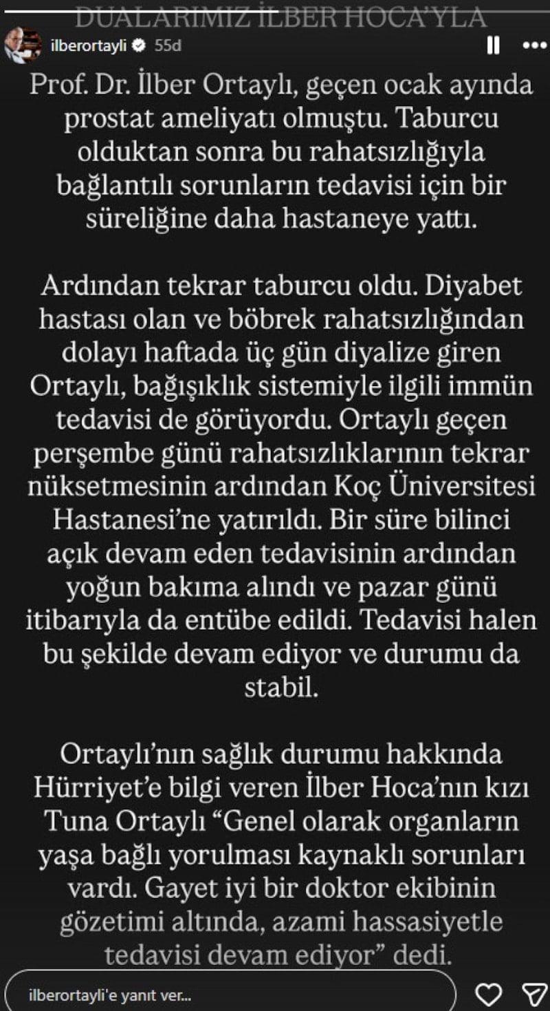 Ortaylı'nın sağlık durumu hakkında Hürriyet'e bilgi veren İlber Hoca'nın kızı Tuna Ortaylı “Genel olarak organların yaşa bağlı yorulması kaynaklı sorunları vardı. Gayet iyi bir doktor ekibinin gözetimi altında, azami hassasiyetle tedavisi devam ediyor” dedi.