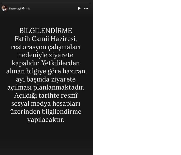 Ortaylı’nın ailesi, mezar ziyaretiyle ilgili kamuoyunu bilgilendirdi. Yapılan açıklamada, Fatih Camii Haziresi’nin restorasyon çalışmaları nedeniyle ziyarete kapalı olduğu belirtildi. Açıklamada, haziran ayı başında yeniden ziyarete açılmasının planlandığı ifade edildi.
