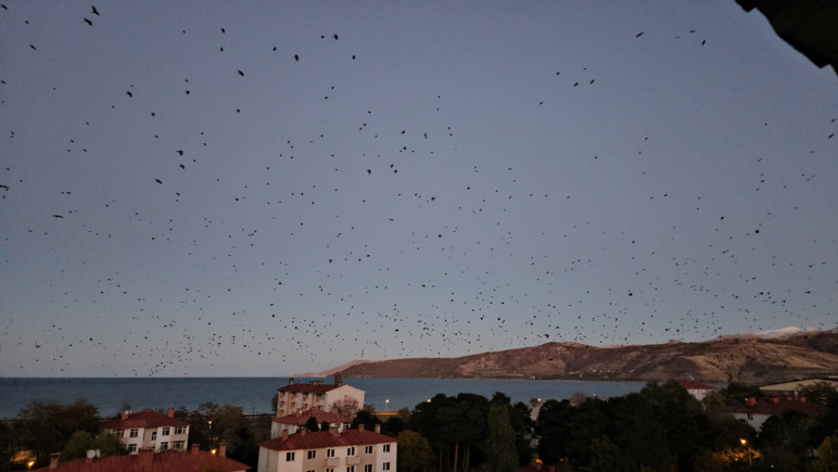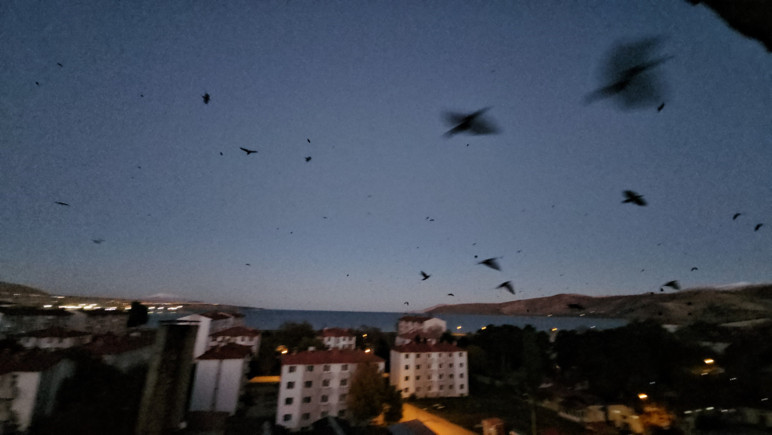 Tatvan ilçesinde akşam saatlerinde gökyüzünde kargaların toplu halde gökyüzünde uzun süre uçmaları dikkat çekti.