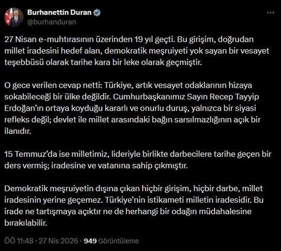 İletişim Başkanı Burhanettin Duran, sanal medya hesabından yaptığı açıklamada, "27 Nisan e-muhtırasının üzerinden 19 yıl geçti. Bu girişim, doğrudan millet iradesini hedef alan, demokratik meşruiyeti yok sayan bir vesayet teşebbüsü olarak tarihe kara bir leke olarak geçmiştir. O gece verilen cevap netti. Türkiye, artık vesayet odaklarının hizaya sokabileceği bir ülke değildir. Cumhurbaşkanımız Sayın Recep Tayyip Erdoğan’ın ortaya koyduğu kararlı ve onurlu duruş, yalnızca bir siyasi refleks değil; devlet ile millet arasındaki bağın sarsılmazlığının açık bir ilanıdır. 15 Temmuz’da ise milletimiz, lideriyle birlikte darbecilere tarihe geçen bir ders vermiş; iradesine ve vatanına sahip çıkmıştır. Demokratik meşruiyetin dışına çıkan hiçbir girişim, hiçbir darbe millet iradesinin yerine geçemez. Türkiye’nin istikameti milletin iradesidir. Bu irade ne tartışmaya açıktır ne de herhangi bir odağın müdahalesine bırakılabilir" dedi.
