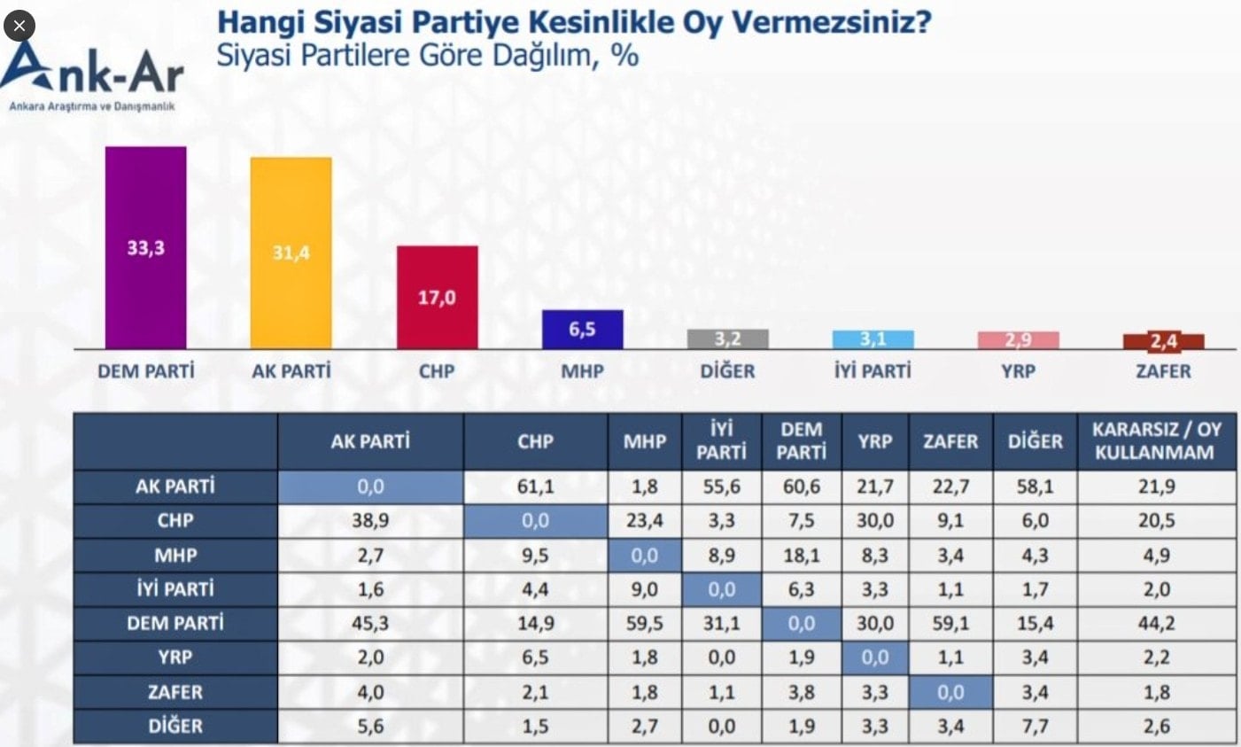DEM PARTİ 1. AKP 2. SIRADAAnkete göre DEM Parti, yüzde 33,3 ile “asla oy verilmez” yanıtında ilk sırada yer aldı. DEM Parti’yi yüzde 31,4 ile AKP izlerken, CHP’ye kesinlikle oy vermeyeceğini söyleyenlerin oranı yüzde 17 olarak ölçüldü.