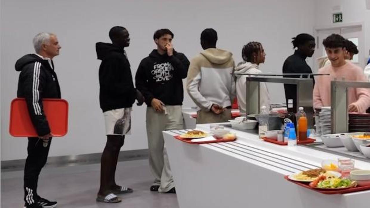 Mourinho'nun akademi oyuncularıyla aynı masada yemek yemesi ve sıraya girerek yemeğini alması sosyal medyada büyük yankı uyandırdı.