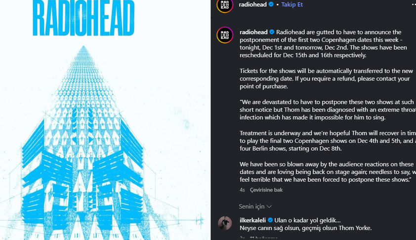 Radiohead’in solisti Thom Yorke’un aşırı boğaz enfeksiyonu nedeniyle 1 ve 2 Aralık tarihlerindeki Kopenhag konserleri iptal edildi.