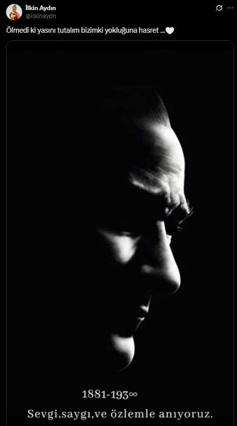 Atatürk'ün üzerinde "Sevgi, saygı ve özlemle anıyoruz" yazılı fotoğrafını paylaşan İlkin Aydın üstüne de kalp emojisiyle şu notu düştü: