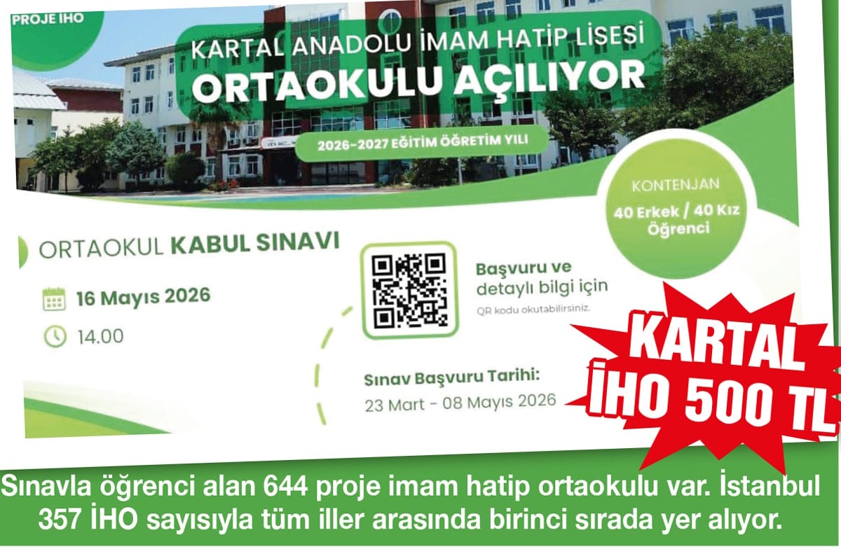 İHL bünyesinde açılacak imam hatip ortaokulu da sınavla öğrenci alacağını ve sınava 4. sınıf öğrencilerinin başvurabileceğini açıkladı. Başvurular, 8 Mayıs’a kadar sürecek. Sınav ise 16 Mayıs tarihinde yaıpılacak. Sınav ücreti 500 TL. Soruları, Kartal İHL hazırlayacak. 40 kız ve 40 erkek öğrenci alınacak. Kayıt hakkı kazananlar, ise temmuz ayında zorunlu yaz okuluna alınacak.