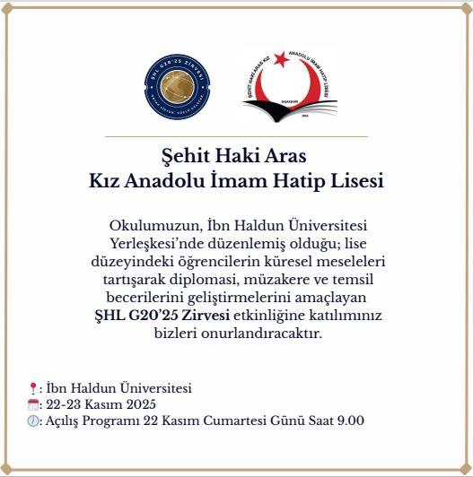 Lise öğrencilerinin küresel meseleleri tartışarak diplomasi, müzakere ve temsil becerilerini geliştirmelerini amaçlayan ŞHL G20’25 Zirvesi, İbn Haldun Üniversitesi’nde 22-23 Kasım 20025 tarihlerinde düzenlenecek. Şehit Hâkî Aras G20 Zirvesi, iki gün süren tartışmaların ardından sonuç bildirgesinin yayınlanmasıyla tamamlanacak.