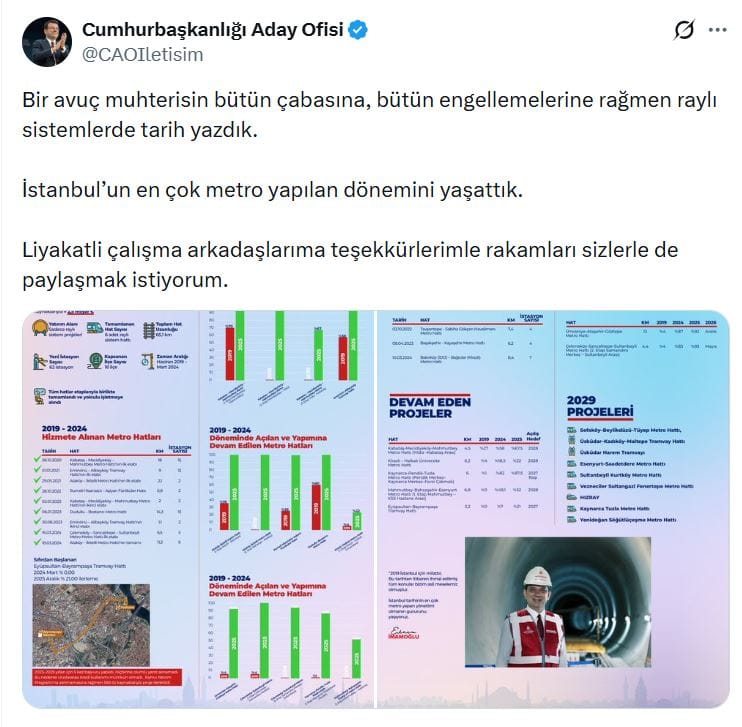 "BİR AVUÇ MUHTERİSİN BÜTÜN ÇABASINA RAĞMEN TARİH YAZDIK"CHP'nin seçilmiş Cumhurbaşkanı Adayı ve İBB Başkanı İmamoğlu, sosyal medya hesabından yaptığı açıklamada "Bir avuç muhterisin bütün çabasına, bütün engellemelerine rağmen raylı sistemlerde tarih yazdık. İstanbul’un en çok metro yapılan dönemini yaşattık" ifadelerini kullandı.