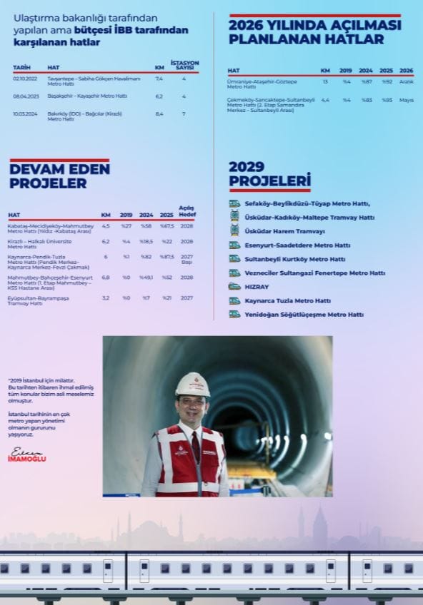 Kabataş-Mecidiyeköy-Mahmutbey (Yıldız-Kabataş): %67,5 ilerleme (2028 hedef)Kirazlı – Halkalı Üniversite Metro Hattı: %22 ilerleme (2028 hedef)Kaynarca-Pendik-Tuzla (Pendik Merkez-Fevzi Çakmak): %87,5 ilerleme (2027 başı hedef)Mahmutbey-Bahçeşehir-Esenyurt (1. Etap): %52 ilerleme (2028 hedef)Eyüpsultan-Bayrampaşa Tramvay Hattı: %21 ilerleme (2027 hedef)