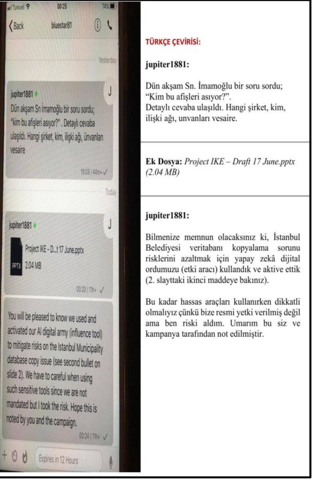 Hüseyin Gün'ün Wickr isimli haberleşme programından Necati Özkan'a, "Bilmenize memnun olacaksınız ki, İstanbul Belediyesi veri tabanı kopyalama sorunu risklerini azaltmak için yapay zeka dijital ordumuzu (etki aracı) kullandık ve aktive ettik. (2. Slayttaki ikinci maddeye bakınız) Bu kadar hassas araçları kullanırken dikkatli olmalıyız çünkü bize resmi yetki verilmiş değil ama ben riski aldım. Umarım bu siz ve kampanya tarafından not edilmiştir." ifadelerini kullanıldığı tespit edilmişti.