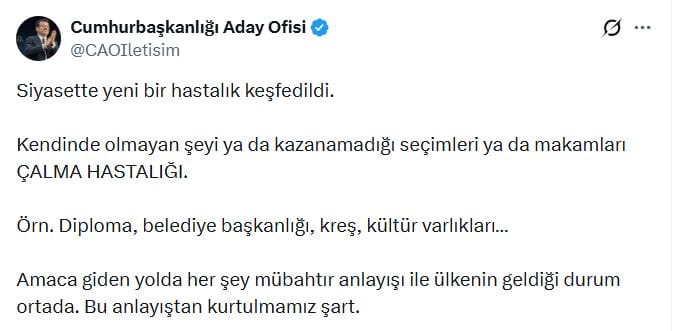 "SİYASETTE ÇALMA HIRSIZLIĞI KEŞFEDİLDİ"23 Mart 2025'ten bu yana Silivri'deki Marmara Cezaevi'nde bulunan Ekrem İmamoğlu, Cumhurbaşkanlığı Aday Ofisi hesabından yaptığı paylaşımda, "Siyasette yeni bir hastalık keşfedildi. Kendinde olmayan şeyi ya da kazanamadığı seçimleri ya da makamları çalma hastalığı" ifadelerini kullandı.